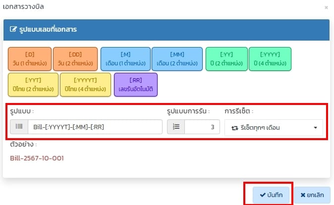 5.ใส่รูปแบบเลขที่ใบวางบิล แล้วกด บันทึก