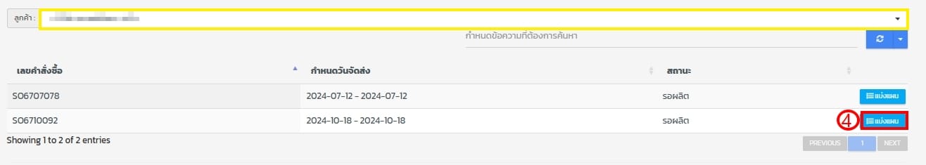 - เลือกรายการใบสั่งขายที่จะแบ่งผลิต (ถ้าจะแบ่งผลิต)