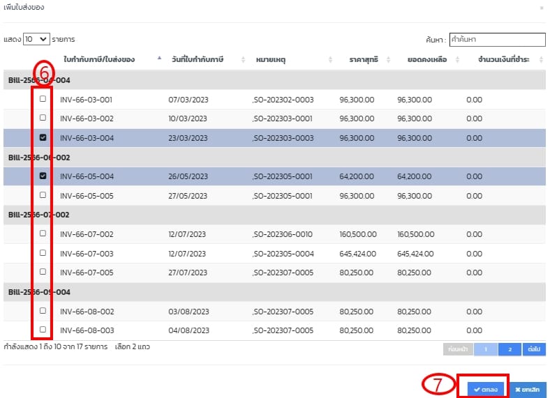 6.เลือกรายการ ใบกำกับภาษี ที่ออกใบวางบิลแล้ว