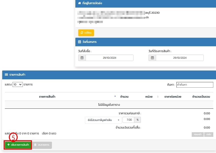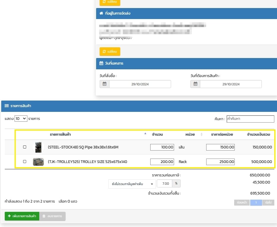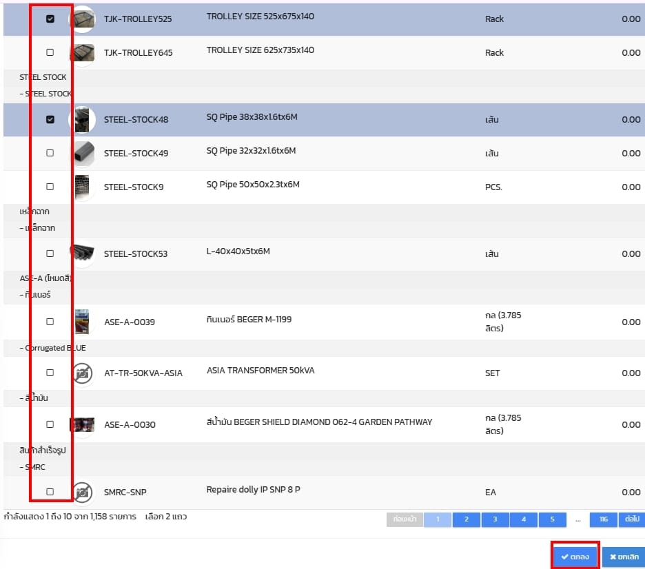 - ติ๊กเลือกสินค้า กดตกลง ใส่รายละเอียดการขาย จำนวน ราคาต่อหน่วย ภาษี