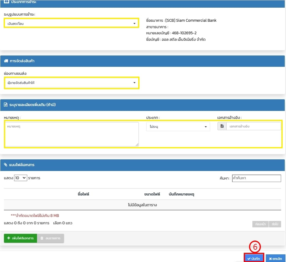 ประเภทการชำระ ช่องทางการจัดส่ง หมายเหตุ และ เอกสารอ้างอิง แม้กระทั่งแนบไฟล์เอกสาร จากนั้นกดบันทึก