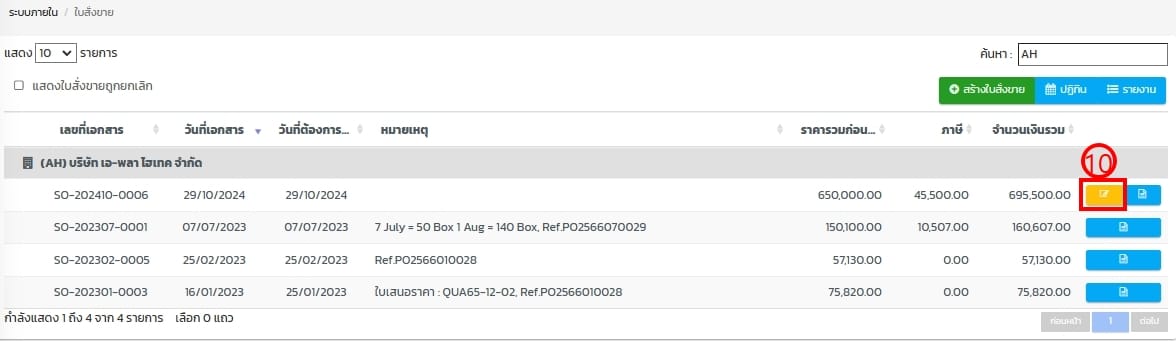 - ถ้าจะแก้ไขกดปุ่มแก้ไข ถ้าจะยกเลิกเอกสารใบสั่งขายนี้กดปุ่มยกเลิก