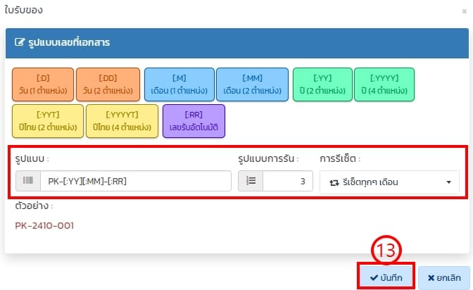 13.ใส่รูปแบบเลขที่ใบรับของ แล้วกดบันทึก