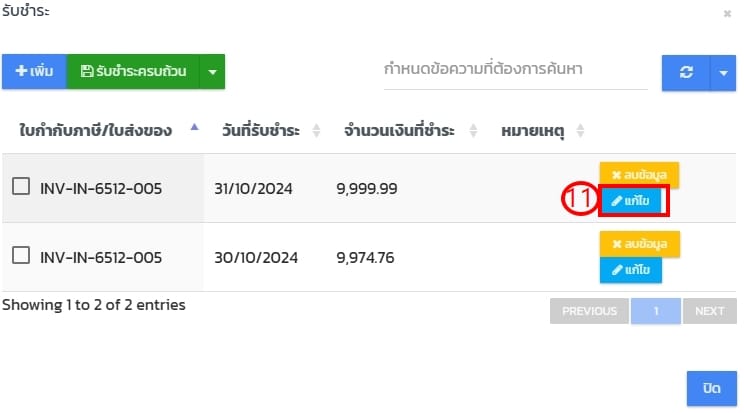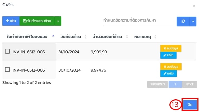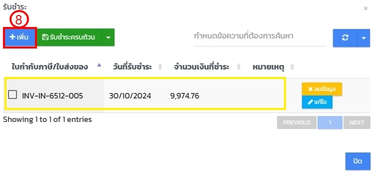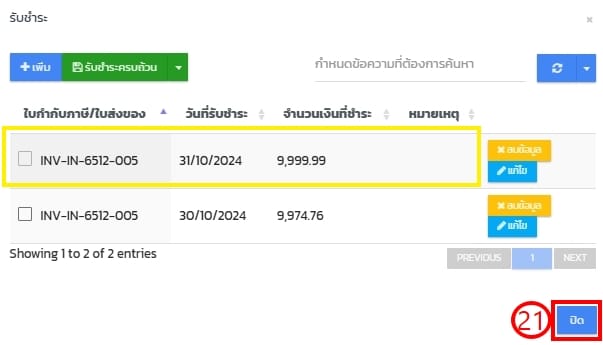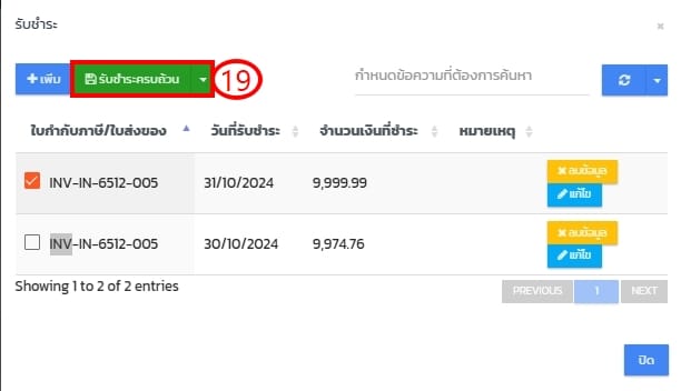 - เลือกติ๊กรายการที่ชำระเงินให้ลูกค้าแล้ว กดรับชำระเงินครบถ้วน