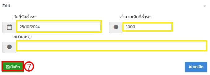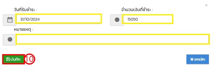 - กำหนดวันที่จะชำระ จำนวนเงิน และหมายเหตุ เช่น วันที่นัดชำระ 31/10/2024