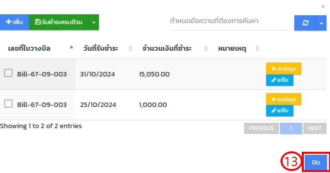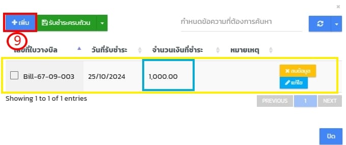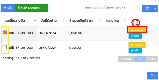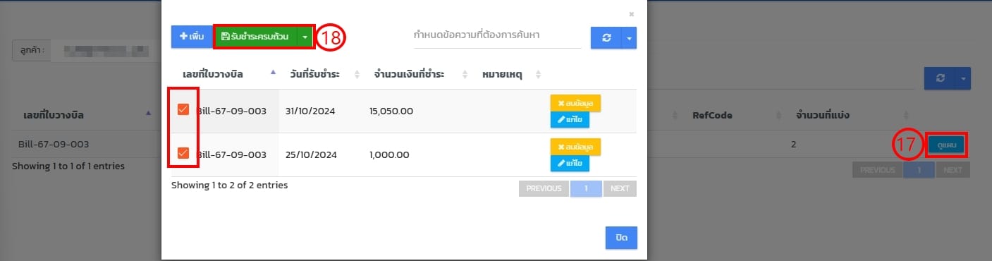 - ติ๊กเลือกรายการที่ชำระหนี้ กดรับชำระหนี้ครบถ้วน