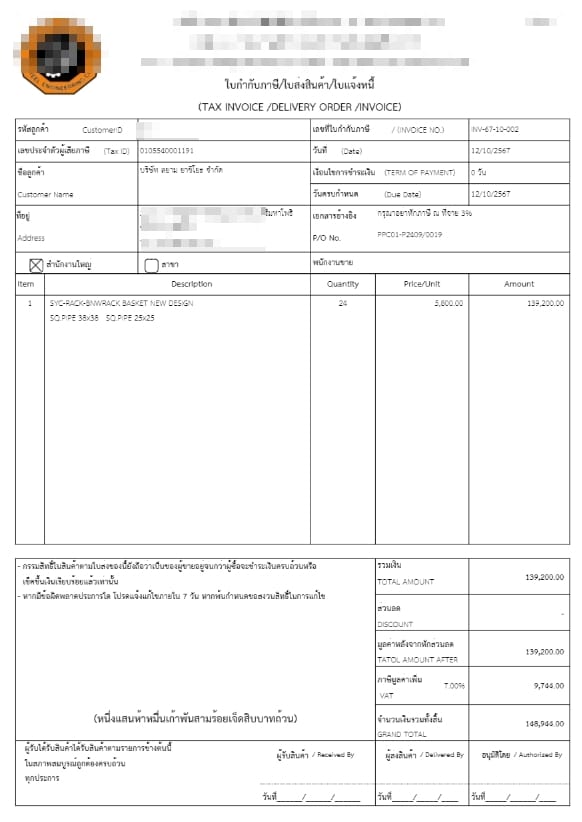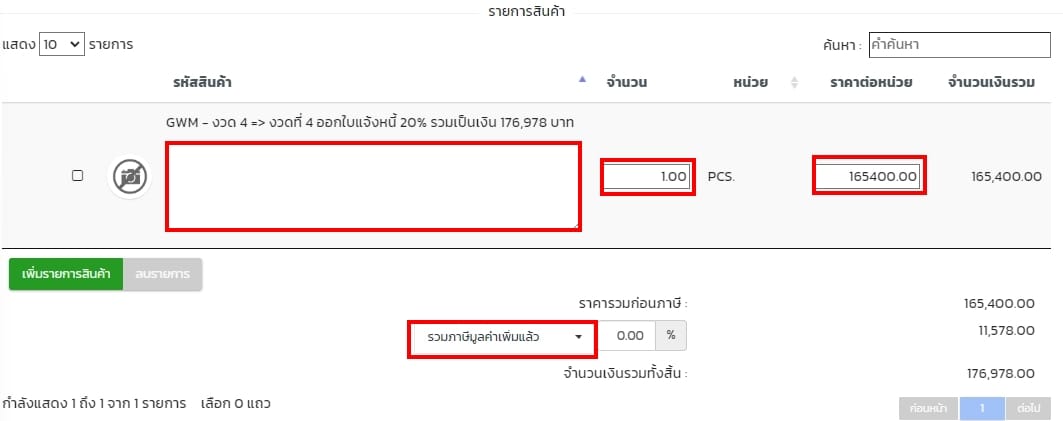 - ใส่รายละเอียด หมายเหตุของสินค้า, จำนวน, ราคาต่อหน่วย,และเลือกภาษี