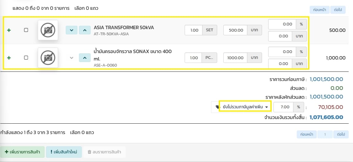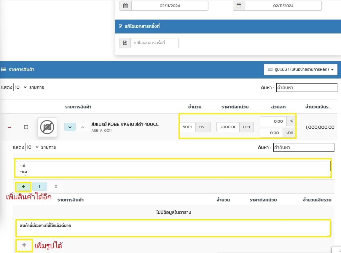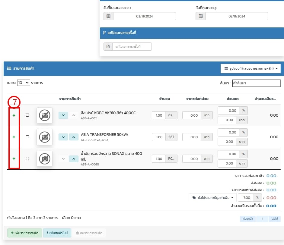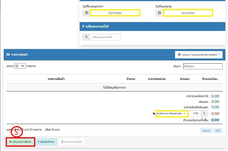 - กำหนดวันที่ กำหนดวันหมดอายุ เลือกภาษี กดเพิ่มรายการสินค้า